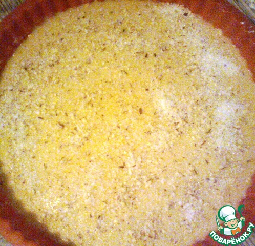 Орехи измельчаем ( например на терке), смешиваем с 0,5 стаканом сахара. Хочу заметить у меня здесь начинки ОЧЕНЬ мало, делала не по рецепту (орехи все на пахлаву ушли). Чем больше начинки тем вкуснее этот пирог!