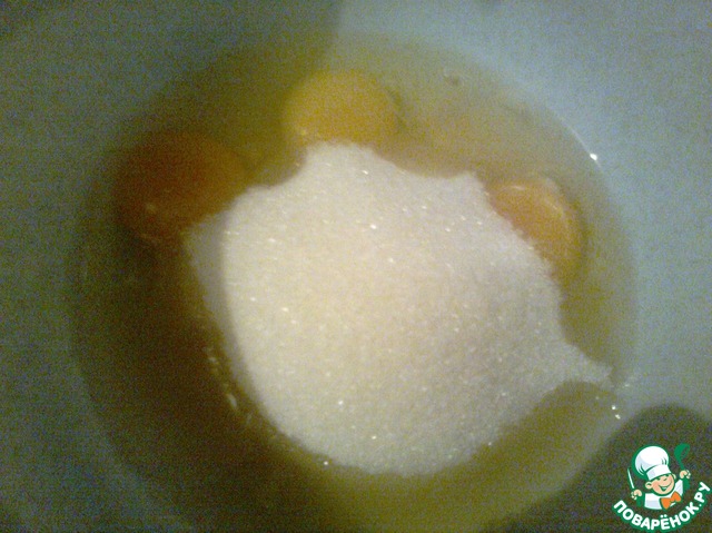 Взбиваем яйца с сахаром как минимум до полного растворения сахара. Чем дольше взбиваем яйца, тем лучше поднимется пирог.