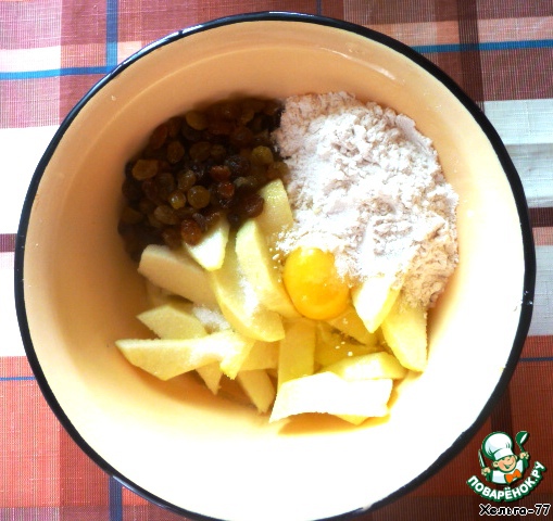 Сливочное масло замораживаем. Яблоки чистим и разрезаем на небольшие дольки. Смешиваем яблоки, 1 яйцо, 1 ст.л. сахара, 1 ст.л. муки, 3 ст.л. молока, изюм.