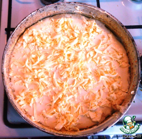 Натираем на крупной терке предварительно замороженное сливочное масло. Внимание! 4 ст.л. оказалось много. Масло расплавилось, подтекло и начало пригорать. Из-за этого подпортился внешний вид пирога и мое настроение. Рекомендую взять меньшее количество масла или отказаться от него совсем.