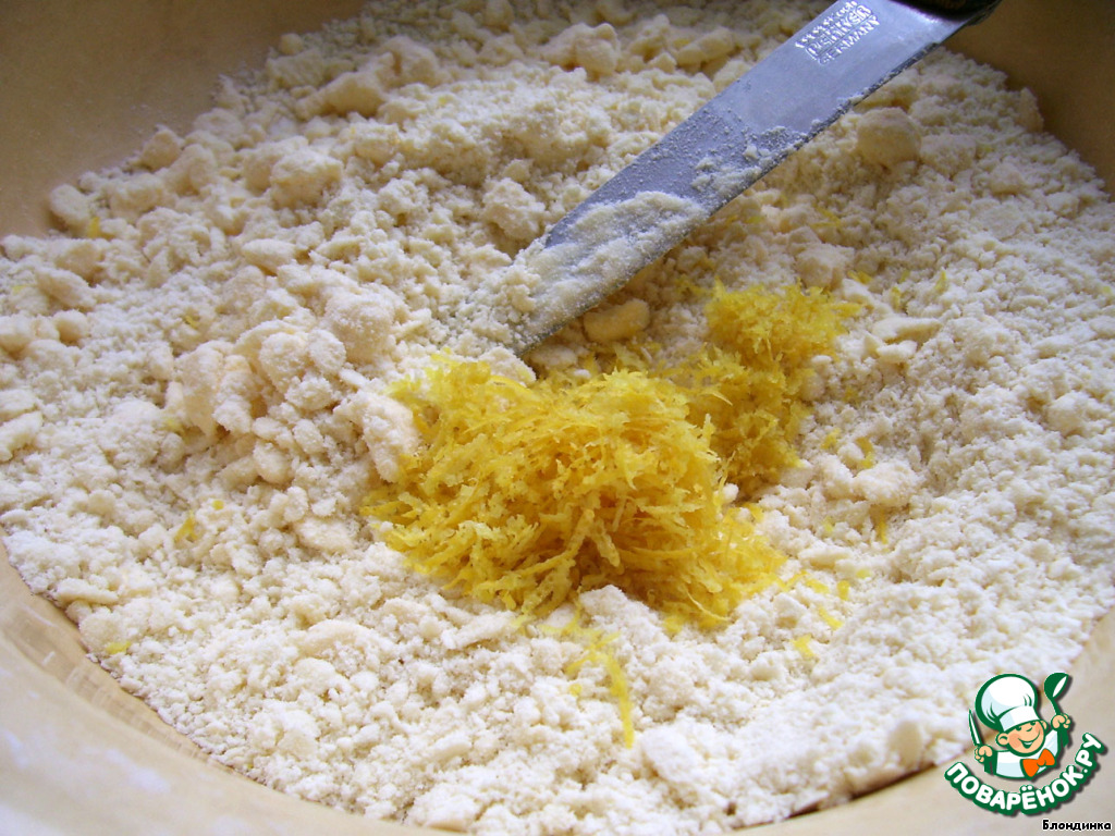 Рубим охлажденное масло с просеянной мукой, добавляем к крошке цедру 1 лимона. В оригинале рецепта предлагается добавить в тесто 1 столовую ложку бренди или коньяка. У меня редко водится и то, и другое, поэтому я не добавляла.