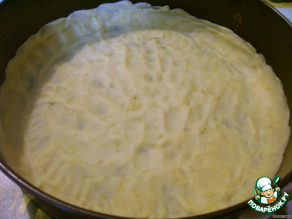 Распределяем бОльшую часть теста по форме (у меня форма диаметром 23 см), делая бортики, убираем на полчаса в холодильник.