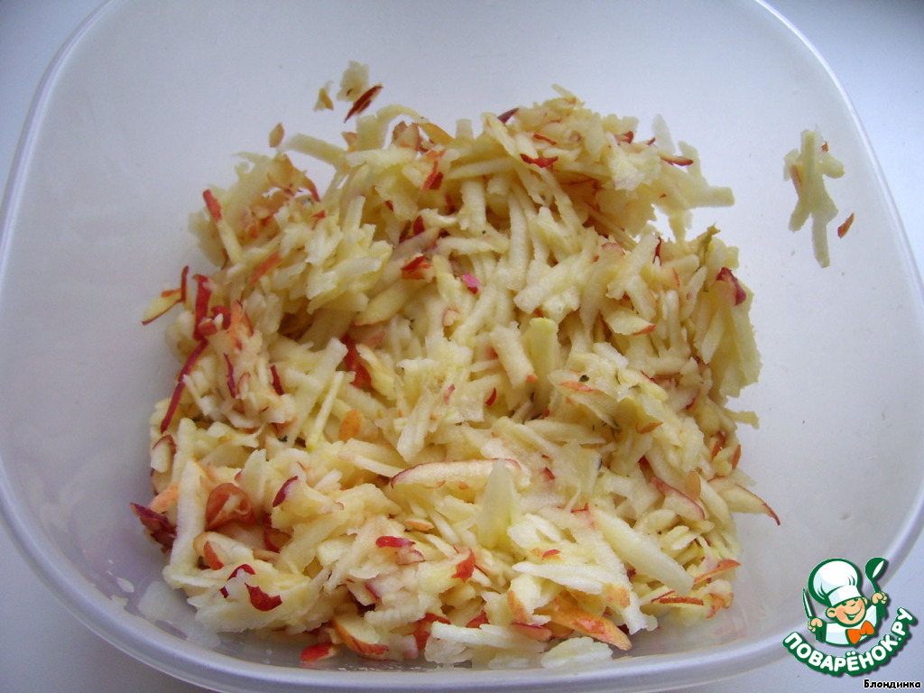 Тем временем приготовим начинку. Натираем яблоки на крупной терке.