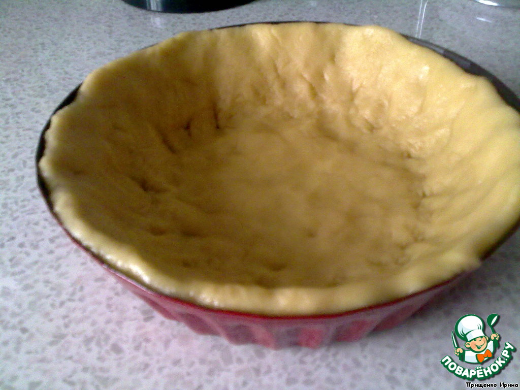 2) Вынимаем форму с полуготовым тестом из духовки, выкладываем начинку, ставим наш полуфабрикат обратно в духовку и выпекаем до готовности при температуре 180 град.