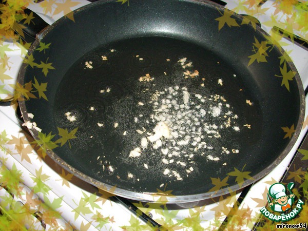 На сковороду наливаем 150 г. подсолнечного масла, несильно раскаливаем и бросаем в него мелко нашинкованный чеснок 2-3 зубчика (можно и давленый). Панировать пол минуты, помешивая, до появления яркого запаха чеснока…