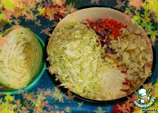 Мелко нашинкуем капусту, порежем мелкими кубиками морковь и яблоки. Лук желательно покрошить помельче…