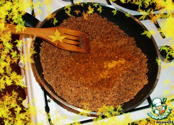 Засыпать в чесночное масло молотые сухари, 1 чайную ложку куркумы, 2 чайных ложки карри и, постоянно помешивая, поджарить до золотистого цвета… минуты 2-3…