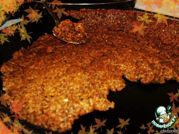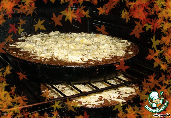 Получившейся золотистой массой тонким слоем покрываем дно и бока формы. У меня для этих целей служит огромная чугунная сковорода…