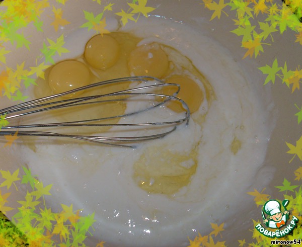 Стакан кефира или ряженки + 4 яйца взбить до однородной массы и добавить в нее остывшие сухари… Хорошенько все перемешать…