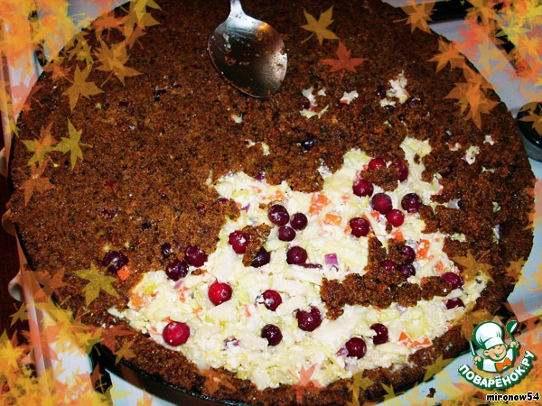 Заполняем сухарно-чесночную основу пирога начинкой, плотно утрамбовывая, а поверху присыпать клюквой…