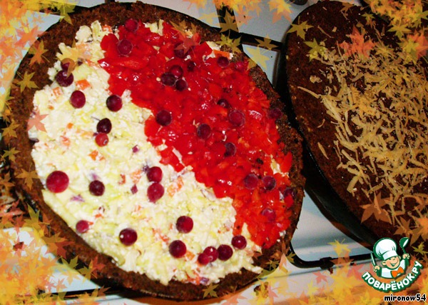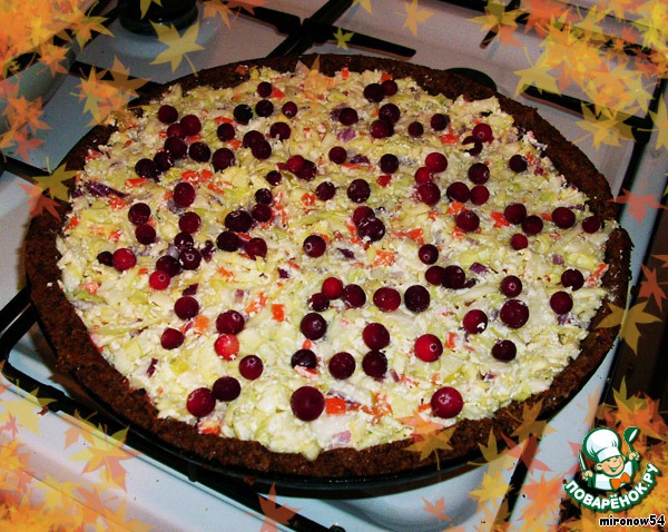 Моя теща любит болгарский перец… Чтобы угодить любимой теще, у второго пирога, поверх капустной начинки укладываю тонкий слой мелко нарезанного болгарского перца и немного клюквы…