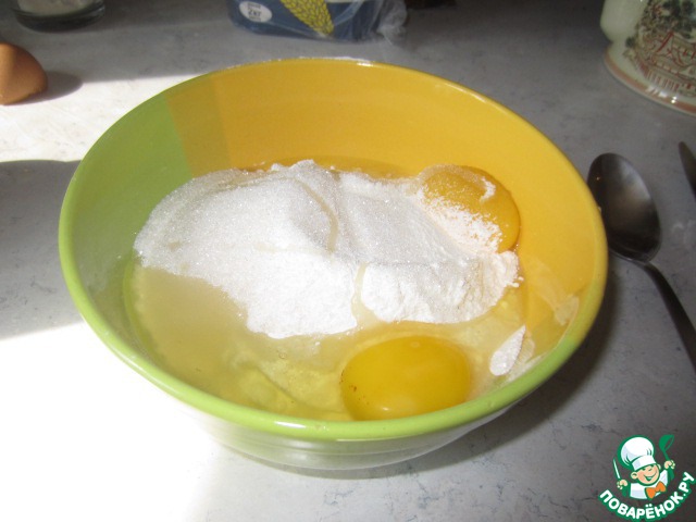 1. Начнём с приготовления основы, для этого смешиваю муку, сахар, соль, яйца (1 целое яйцо и 1 желток) и всё перемешиваю.