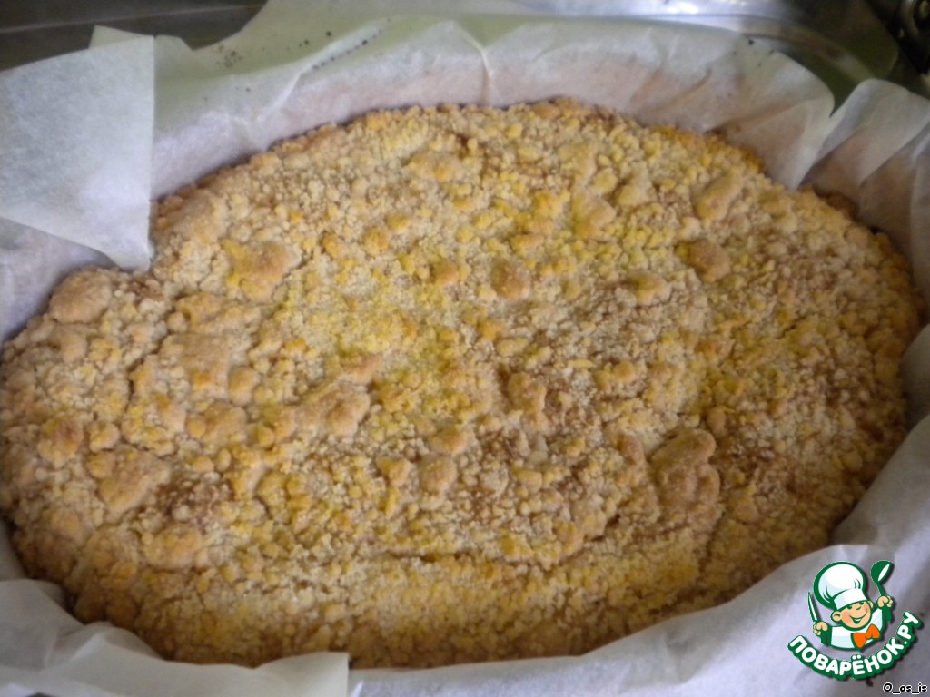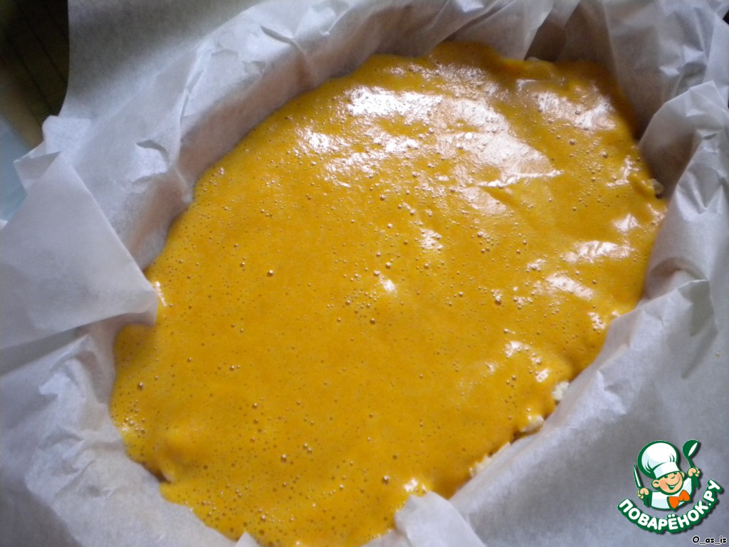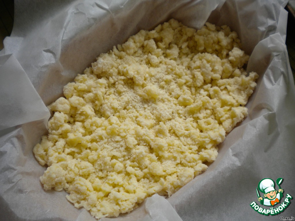 Включила духовку (200 град). 3/4 теста высыпала в подготовленную форму для выпечки. Борта особо поднимать не стала.