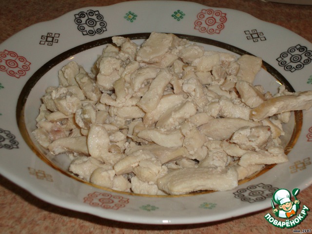 Куриную грудку нарезать не сильно мелко и обжарить на растительном масле.