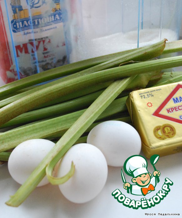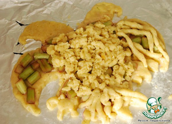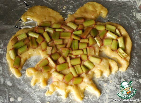 Выкладываем сверху ревень, сиропа совсем немного, а то потечет.