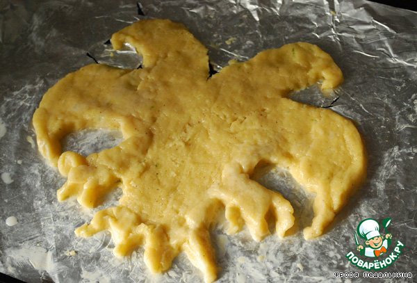 Другую раскатываем, вырезаем фигуру орла, можно по макету, я от руки делала. Аккуратно переносим на смазанный противень.