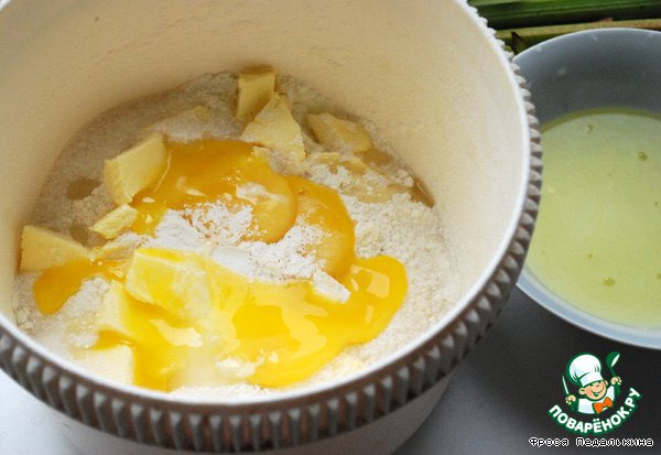 Желтки отделить от белков, присоединить к муке. Деревянной лопаткой размешать в крошку. Холодными руками быстро замесить песочное тесто, скатать в шар и убрать в холодильник на 2 часа.