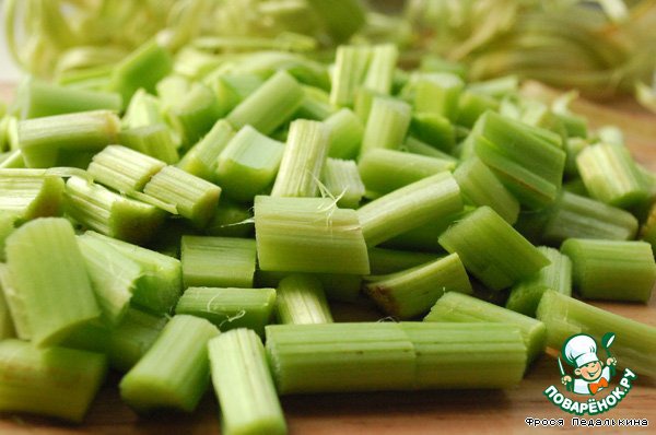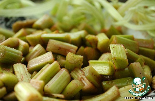 Ревень обрезать, очистить от тонкой кожицы, порезать на кусочки в 1-1,5 см.