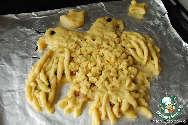 Достаем вторую половину теста, часть натираем на крупной терке и выкладываем на тело и ноги орла. Отщипываем от теста по кусочку, раскатываем в руках до тонкой колбаски, укладываем на крылья и хвост в виде перьев.