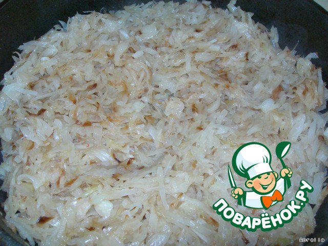 Сначала режем капусту и лук и обжариваем их на сковороде, не накрывая крышкой, иначе капуста уже будет тушеной.