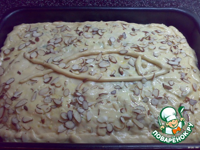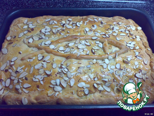 Я пирог особо не украшала: раскатала кусочек теста тонким жгутиком и выложила символическую рыбку поверх пирога. Смазала молоком и посыпала пластинками миндаля.