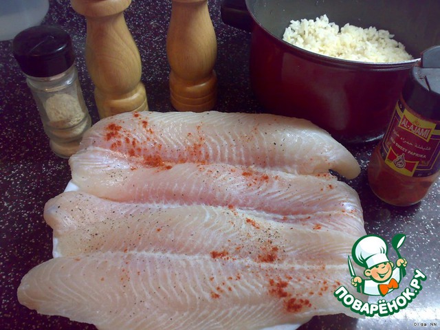 На рис выкладываем рыбное филе,