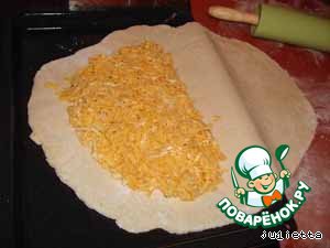 и, наконец, третий слой, состоящий из нарезанного полутвёрдого сыра. При желании все ингридиенты начинки можно перемешать заранее и выкладывать одновременно, без слоёв. Увлажните водой край теста, лежащего на противне.