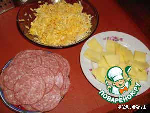 Колбасу порежьте тонкими кружочками. Полутвердый сыр порежьте мелкими кубиками или пластинками.