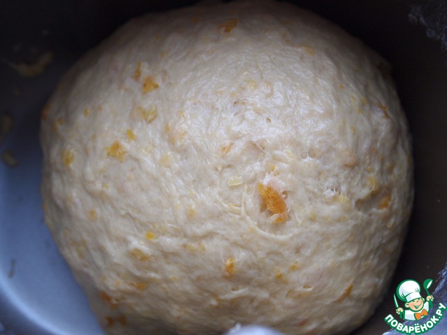 Соединить дрожжи, соль, молоко, размягченное сливочное масло, тростниковый сахар (3 ст. л.), муку и курагу.