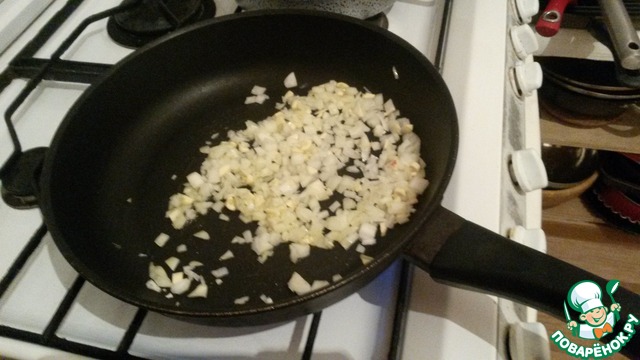 Далее нарезать более менее мелко лук и чеснок, быстро обжарить на сковороде с небольшим количеством масла - буквально до мягкости и появления вкусного аромата.