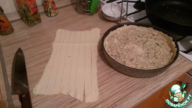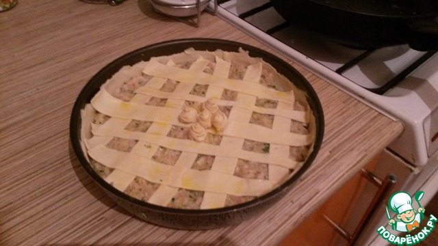 Раскатать тоненько оставшуюся меньшую часть теста, вырезать полосочки в см шириной. Украсить пирожок симпатичной решеточкой.