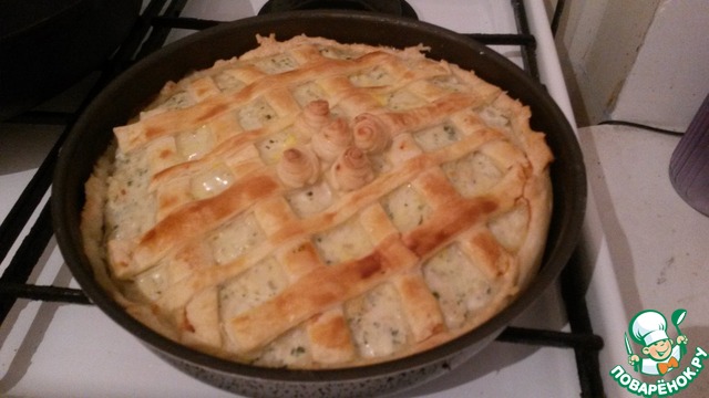 При необходимости пройтись ножиком между формой и бортиком, вытащить пирог и выложить на блюдо. Подавать тут же!