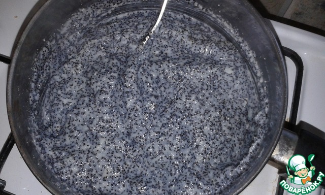 В кастрюльку влить молоко, добавить оставшиеся 100 г сахара, манку, мак и варить при постоянном помешивании до закипания. Затем выключить огонь и оставить на 10 минут, перемешивая за это время 3-4 раза