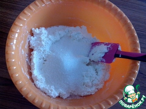 Творог смешать со сметаной и сахаром.
