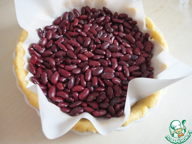 Тесто прикрыть пергаментом, сверху насыпась сухую фасоль или горох. Выпекать 10 минут.