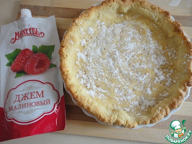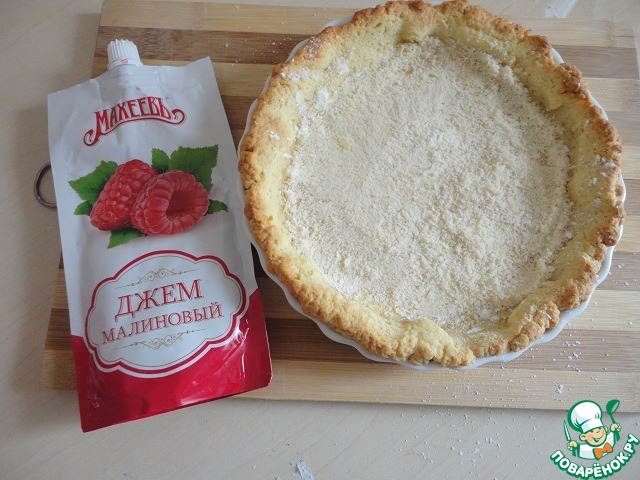 Вынуть форму, удалить фасоль или горох и бумагу. Равномерно присыпать дно крахмалом. В этом рецепте можно использовать любой джем красных оттенков. Если вы берёте малиновый, тогда необходимо протереть его через сито.