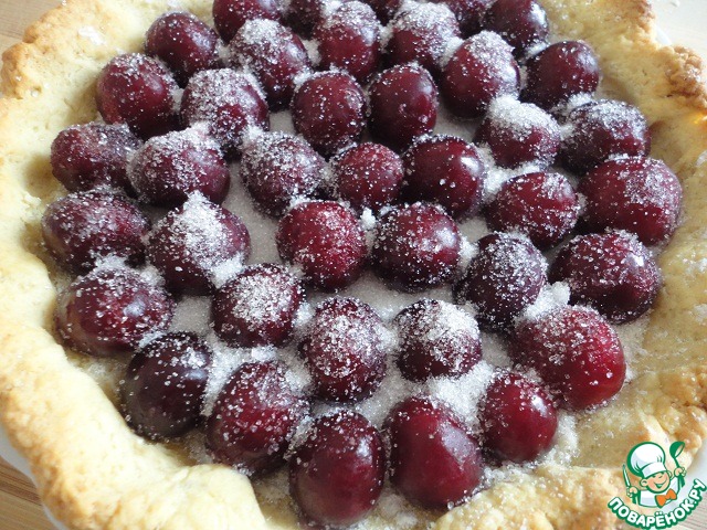 Посыпать измельченным миндалём. Крахмал с миндалём впитают в себя выделяемый сок от вишни.