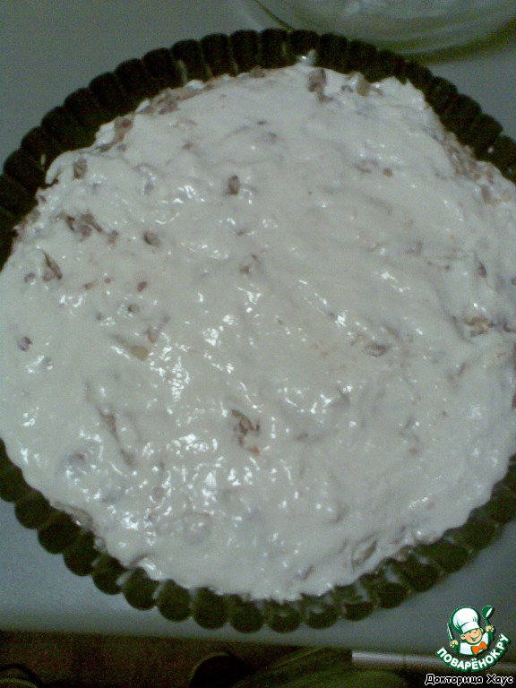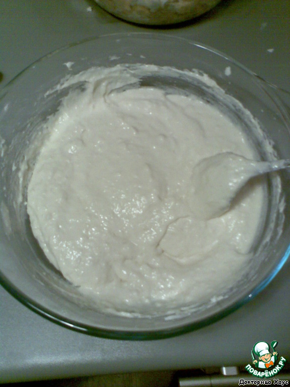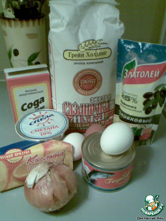 Теперь тесто. Отдельно смешать сметану и майонез, добавить муку и погашенную соду. Я гашу лимонной кислотой или кипятком. Ну, или купите пакетик разрыхлителя для теста.