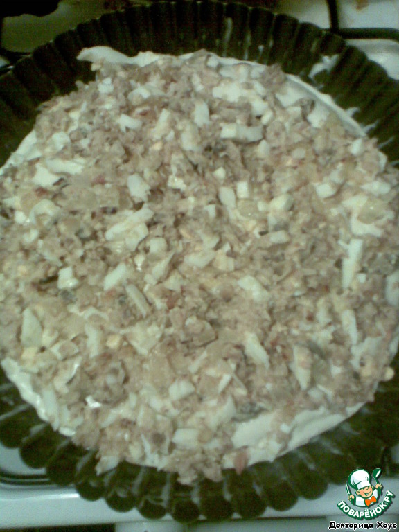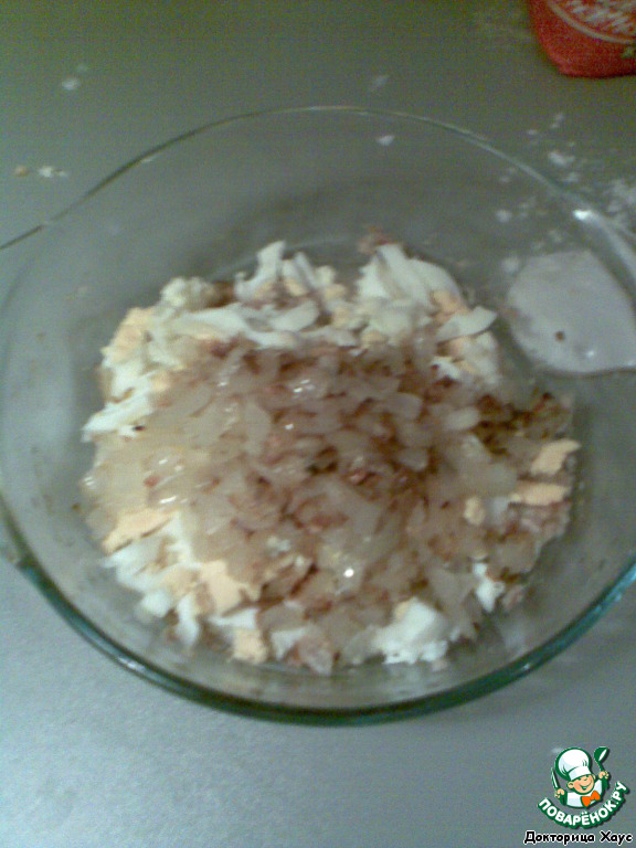Добавить к консервам яйца и лук. Перемешать. Начинка готова.)