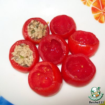 У помидоров срезать верхушки, извлечь мякоть и начинить приготовленной начинкой.