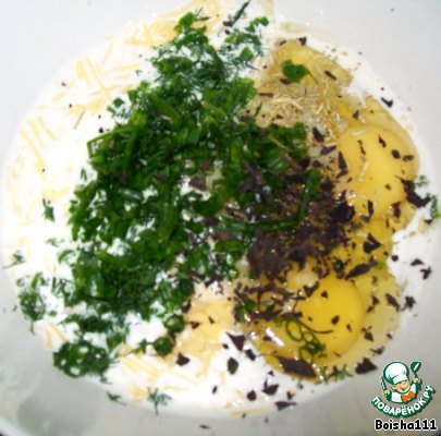 В миске смешать оставшийся сыр, яйца, сливки, соль, рубленную зелень и базилик, давленный чеснок (пару зубчиков), специи по желанию (я добавила чуть-чуть розмарина).