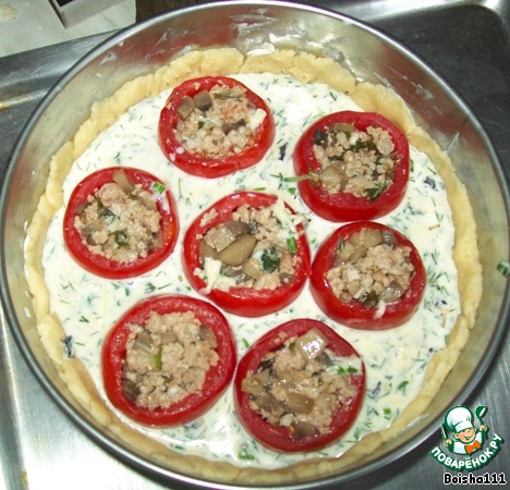 Тесто выложить в форму (смазанную маслом, а лучше выстланную пергаментом), разровнять и проколоть вилкой. Выложить помидоры срезом вверх и залить яично-сырной смесью. По желанию сверху между помидорами присыпать тертым сыром.