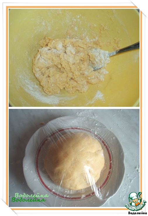 смешать два вида муки с разрыхлителем и маслом (или маргарином) и растереть всю эту массу в крошку пальцами. Масло (или маргарин) должно быть мягкое, но не растопленное. Добавить 1 яйцо и хорошо вымешать. После добавляем воду, но только не всю сразу, а по 1ст.л и замешиваем эластичное тесто. Готовое тесто накрыть пленкой и поставить в холодильник на 30 минут.