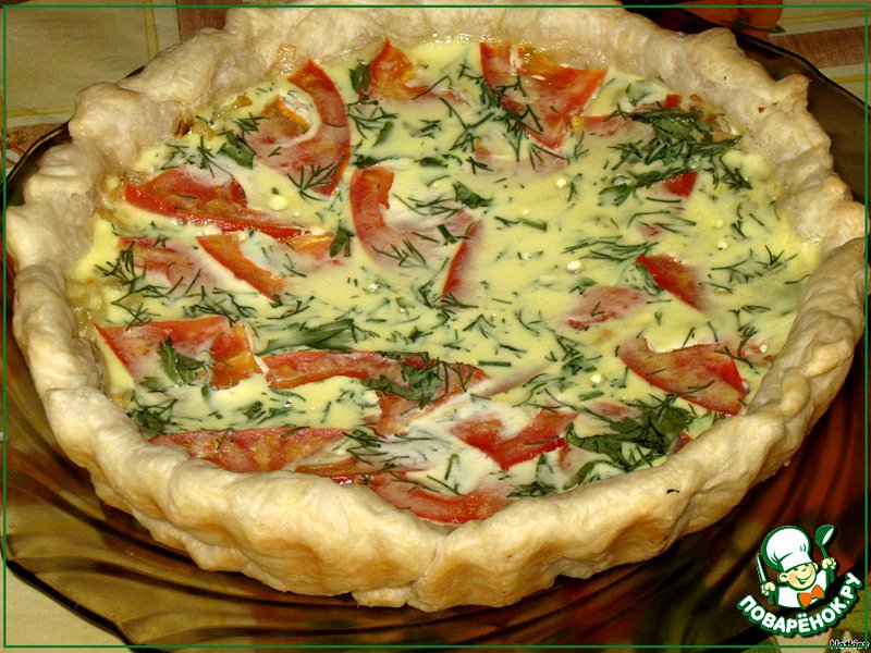 4. Взбиваем яйца со сметаной, солим, перчим, добавляем рубленую зелень и заливаем наш пирог.