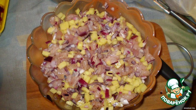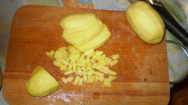 Нарезаем небольшими кубиками картофель. Добавляем к куриным грудкам.