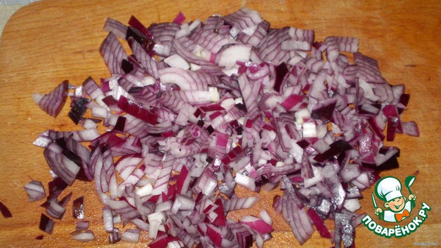 Нарезаем небольшими кубиками лук. Добавляем к полученной начинке.