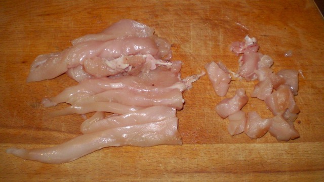 Нарезаем куриную грудку маленькими кусочками.