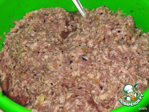 добавим 1 измельченную луковицу, 4 измельченных зубчика чеснока, 1 ст. ложку соевого соуса, 1 натертую на мелкой терке картошку, 3 ст. ложки овсяных хлопьев, соль, специи по вкусу.