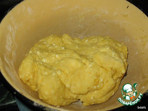 Замешиваем тесто: взбить яйцо с творогом, добавить растопленное масло, соль и соду. Добавляем муки, пока не получится не липкое тесто.
