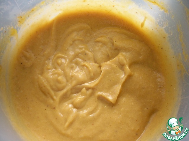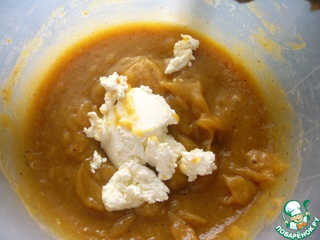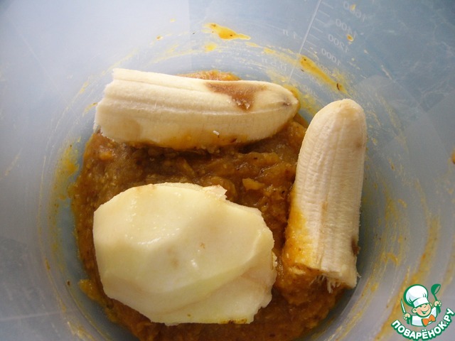 Приготовить начинку. Тыкву измельчить блендером в пюре, добавить грушу, очищенную от кожи и семян, и банан
